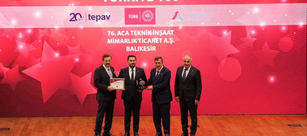 ACA Teknik İnşaat, TOBB tarafından düzenlenen “Türkiye 100” yarışmasında üst üste ikinci kez Türkiye'nin en hızlı büyüyen 100 şirketi arasında yer aldı. Böylece iki dönemi kapsayan dört yıllık istikrarlı büyümesini taçlandıran şirket, ödülünü 22 Eylül’de Ankara'da yapılan törende Cumhurbaşkanı Yardımcısı Sayın Cevdet Yılmaz ve TOBB Başkanı Sayın M. Rifat Hisarcıklıoğlu'nun elinden aldı.